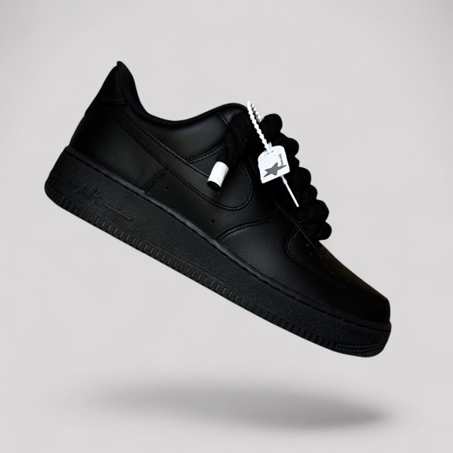 Hand-finished custom Nike Air Force 1 black with signature black rope laces. Minimal look, maximum impact. Clean base, bold texture made for daily wear.