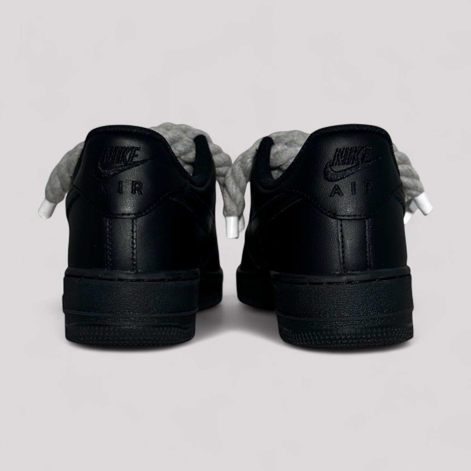 Hand-finished custom Nike Air Force 1 with signature grey rope laces by Kosmo Studio. Minimalist tones, bold texture, and timeless everyday style.