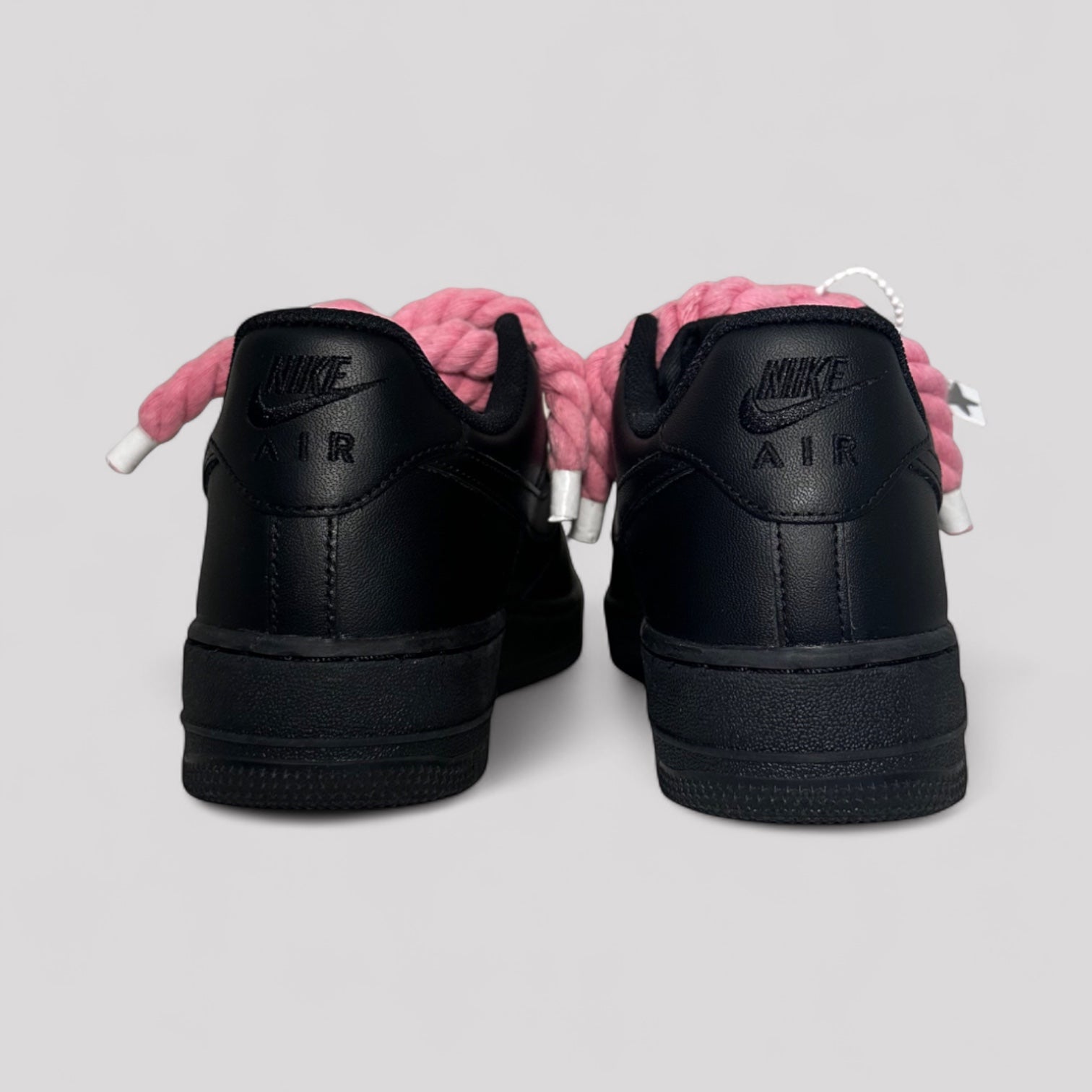 Black elegant Nike AF1 with bold pink rope laces. Easy to stand out.